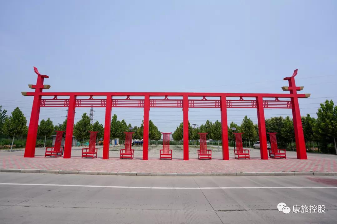 景觀位于韓信公園對面停車場入口,整體以紅色形象呈現(xiàn),體現(xiàn)漢代建筑色彩基調(diào),在框架和細節(jié)方面,通過研究漢代史料、壁畫提取漢代建筑結(jié)構構件和裝飾,形成具有漢代特色的八柱七門朱漆描金對稱式景觀構筑藝術小品。構筑物中增加了“椅子”元素,椅子代表著停歇休憩,如同古代驛站有下馬休息的意思,與現(xiàn)代停車場異曲同工。構筑物具有牌坊的規(guī)制特點,營造主街道漢代氛圍的同時為停車場增加景觀藝術感。同時,停車場是游客集中之地,線性的構架形式為游客拍照合影提供了場地和背景,個性化的互動體驗,讓這里成為了網(wǎng)紅打卡點。