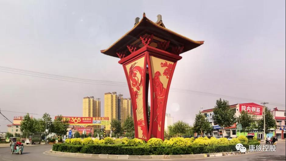 雕塑作品常在景觀道路入口空間中起著標(biāo)志的作用。這就要求雕塑的設(shè)計必須適應(yīng)交通功能,不能影響行人正常通行,不能遮擋交通視線。放在道路入口的雕塑,無數(shù)行人都能感受到它存在,成為街區(qū)入口空間與人對話和交流的媒介。如下圖為行唐幸福路商業(yè)街入口的鏤空雕塑設(shè)計。