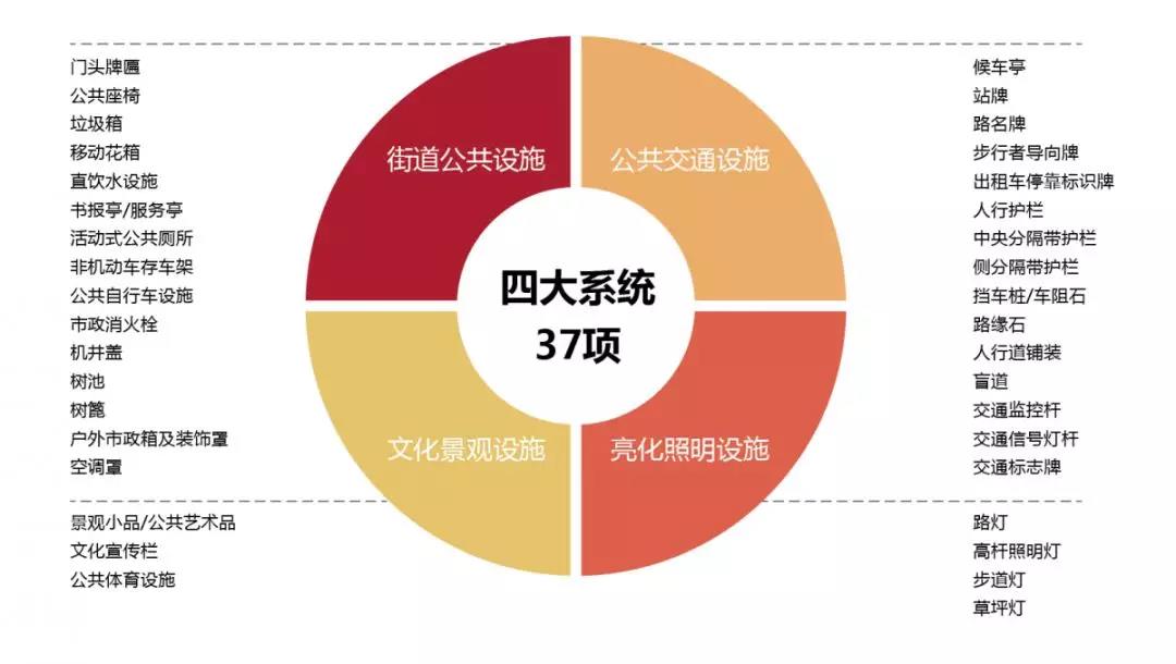 我們根據(jù)城市家具的功能屬性,對城市家具各類設(shè)施進行系統(tǒng)性分類,依據(jù)現(xiàn)狀,可暫分為街道公共設(shè)施、公共交通設(shè)施、文化景觀設(shè)施、亮化照明設(shè)施四大系統(tǒng)三十七項。