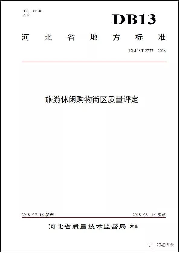 為促進(jìn)全省旅游購(gòu)物標(biāo)準(zhǔn)化、規(guī)范化、品牌化發(fā)展,由河北省文化和旅游廳、康旅控股集團(tuán)文旅工程建設(shè)版塊智力資源中心共同制定的河北省地方標(biāo)準(zhǔn)《旅游休閑購(gòu)物街區(qū)質(zhì)量評(píng)定》(DB13/ T 2733—2018),于2018年8月16日正式實(shí)施。