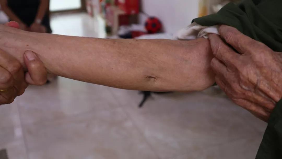 我注意到周老的小臂上有一個(gè)傷口,周老說(shuō)這是他打的第一仗留下的痕跡。那是1946年攻打熱河,周老作為尖刀隊(duì)的第二梯隊(duì),帶領(lǐng)13人,向敵人的陣地發(fā)起沖鋒。當(dāng)時(shí)的地形,只有北面這一條路,其他三面靠山臨水無(wú)法進(jìn)攻。周老和兩位戰(zhàn)友組成一組作戰(zhàn),突然后面槍聲響起,敵人從后面包抄,阻斷了他們的進(jìn)攻。當(dāng)時(shí)腹背受敵,九死一生,周老和戰(zhàn)友們只能拼死一搏。周老的手臂、腰部中彈,其他兩位戰(zhàn)友也或輕或重地受傷了。最終增援部隊(duì)趕到,這才躲過(guò)了鬼門關(guān),但是留下的傷痕卻讓我感受到了戰(zhàn)爭(zhēng)的激烈。