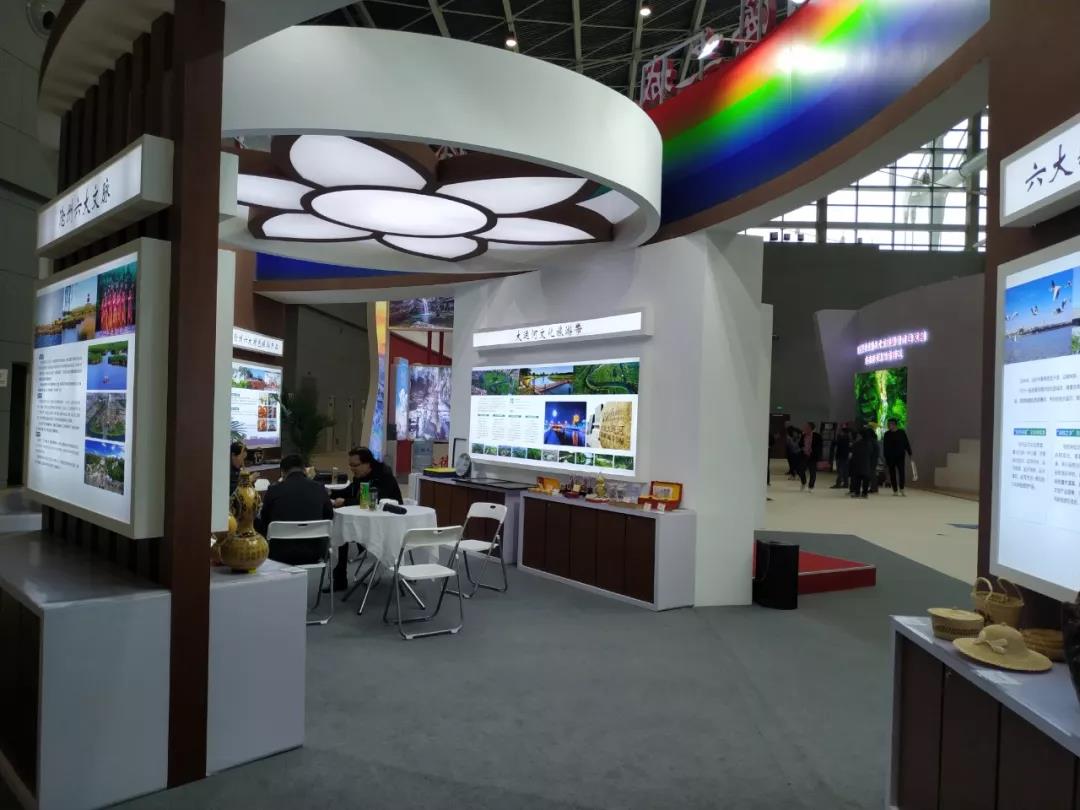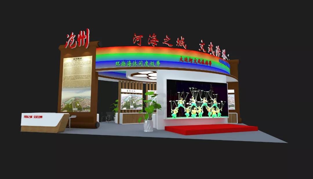 第二十四屆中國北方旅游交易會于10月14-16日在石家莊國際會展中心舉辦,交易會上,東道主河北館亮點紛呈。河北館展覽面積8000平方米,由6個特色主題展區(qū)及13個地市展區(qū)組成,其中滄州市展區(qū)由我集團精心打造,為大家?guī)砹艘粓鰟e開生面的交易盛會。滄州素來有海河之城的美譽,海即是渤海,河便是大運河。方案設(shè)計出入口以浪花為造型,突出滄州河海之城的特色。頂部環(huán)形吊頂,三條交互的彩帶表現(xiàn)大運河文化旅游帶、環(huán)渤海休閑度假帶和沿雄安生態(tài)旅游帶。中間部分頂部造型則借鑒了文物“滄州鐵獅子”背上的蓮花,凸顯其文化底蘊。