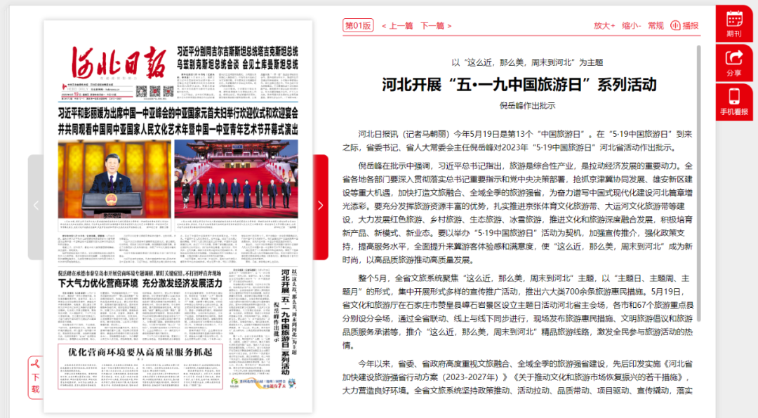 省委書記、省人大常委會主任倪岳峰對2023年“5?19中國旅游日”河北省活動作出批示:習近平總書記指出,旅游是綜合性產(chǎn)業(yè),是拉動經(jīng)濟發(fā)展的重要動力。全省各地各部門要深入貫徹落實總書記重要指示和黨中央決策部署,搶抓京津冀協(xié)同發(fā)展、雄安新區(qū)建設等重大機遇,加快打造文旅融合、全域全季的旅游強省,為奮力譜寫中國式現(xiàn)代化建設河北篇章增光添彩。要充分發(fā)揮旅游資源豐富的優(yōu)勢,扎實推進京張體育文化旅游帶、大運河文化旅游帶等建設,大力發(fā)展紅色旅游、鄉(xiāng)村旅游、生態(tài)旅游、冰雪旅游,推進文化和旅游深度融合發(fā)展,積極培育新產(chǎn)品、新模式、新業(yè)態(tài)。要以舉辦“5·19中國旅游日”活動為契機,加強宣傳推介,強化政策支持,提高服務水平,全面提升來冀游客體驗感和滿意度,使“這么近,那么美,周末到河北”成為新時尚,以高品質(zhì)旅游推動高質(zhì)量發(fā)展。