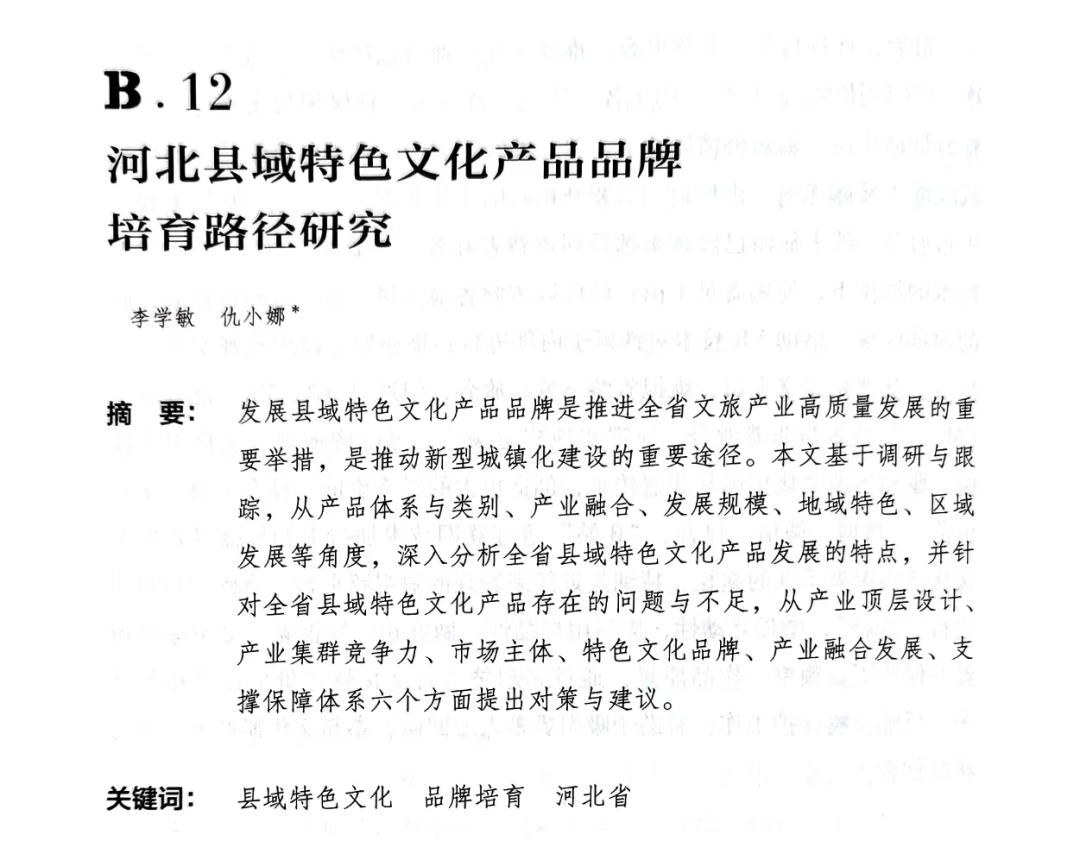 其中,我院所發(fā)表的《河北縣域特色文化產(chǎn)品品牌培育路徑研究》文章全面介紹了發(fā)展縣域特色文化產(chǎn)品品牌在推進(jìn)全省文旅產(chǎn)業(yè)高質(zhì)量發(fā)展的重要舉措,分別從總體情況、存在不足、發(fā)展策略等角度進(jìn)行探究,對(duì)新形勢(shì)下河北省縣域特色文化產(chǎn)品品牌的培育路徑具有較深的推廣借鑒意義。