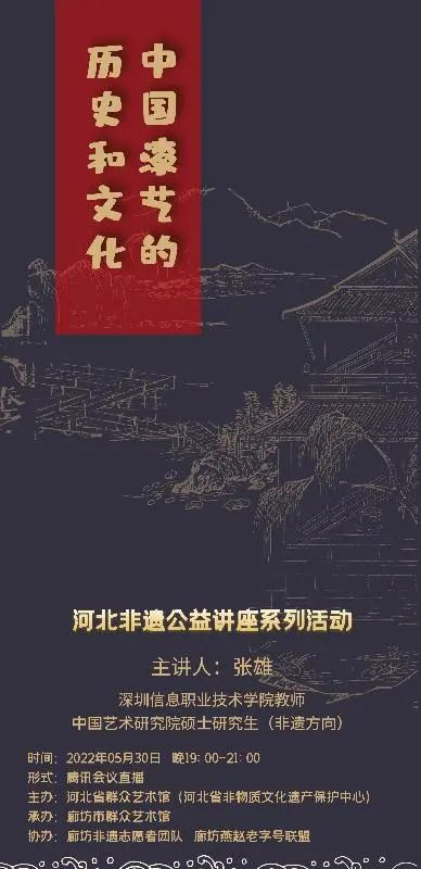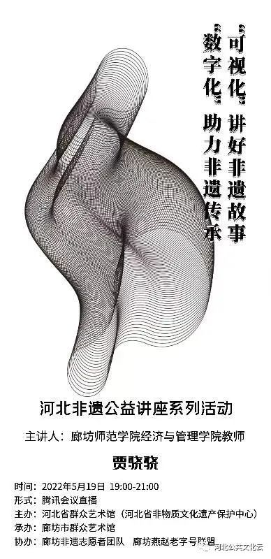為貫徹落實(shí)國(guó)家及省有關(guān)非遺保護(hù)工作政策文件精神,加強(qiáng)非遺工作人員和傳承人群能力建設(shè),提升非遺保護(hù)工作人員的業(yè)務(wù)水平和管理效能,增強(qiáng)非遺傳承人的傳承能力和創(chuàng)新意識(shí),為全省非遺保護(hù)高質(zhì)量發(fā)展提供智力支持和人才保障,由河北省群眾藝術(shù)館(河北省非物質(zhì)文化遺產(chǎn)保護(hù)中心)主辦,廊坊市群眾藝術(shù)館承辦,廊坊非遺志愿者團(tuán)隊(duì)、廊坊燕趙老字號(hào)聯(lián)盟協(xié)辦的河北非遺公益講座系列活動(dòng)將于2022年5月中旬開始,持續(xù)在線上開展。