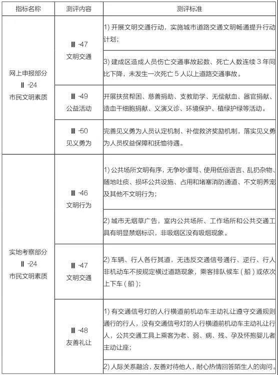對照《全國文明城市測評體系》的網(wǎng)上申報、實地考察、問卷調(diào)查 3 種方式的測評指標(biāo),其中網(wǎng)上申報第 24 條、實地考察第24 條測評指標(biāo)均詳細(xì)列出對市民文明素質(zhì)的要求。網(wǎng)上申報部分主要有市民文明交通、公益活動、見義勇為三個測評內(nèi)容,具體要求涵蓋文明交通、扶貧幫困、慈善捐助、支教助學(xué)、無償獻血、器官捐獻、造血干細(xì)胞捐獻、義演義診、環(huán)境保護、植綠護綠、見義勇為 11 項文明行為。實地考察部分主要有文明行為、文明交通、友善禮讓三個測評內(nèi)容,具體包括無爭吵謾罵、不使用低俗語言、不亂扔雜物、不隨地吐痰、不損壞公共設(shè)施、不占用和堵塞消防通道、禁煙區(qū)不吸煙、文明排隊、文明養(yǎng)寵、文明交通、主動禮讓行人、公交車主動讓座等