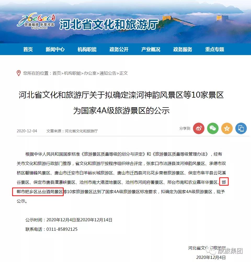 據(jù)河北省文化和旅游廳發(fā)布公示,邯鄲市肥鄉(xiāng)區(qū)叢臺(tái)酒苑景區(qū)在內(nèi)的10家旅游景區(qū)擬確定為國(guó)家4A級(jí)旅游景區(qū)。熱烈祝賀!